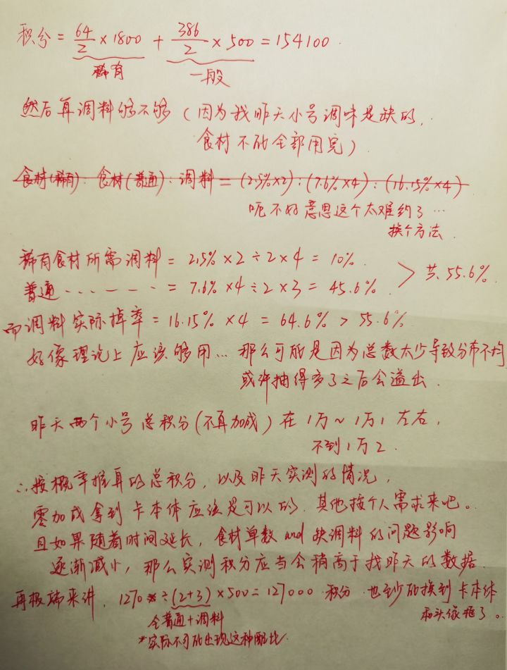 攻略 #筑梦公馆# #琳琅美食季#大概也算不上是啥攻略 一些自己写的小心得还有计算过程截图昨天开服自己在超话写的小tips。先复制粘贴一下昨天的内容:tip1:加成卡是做菜时加成(所以不用换展示卡!不用换助战卡!)(助战卡sp比ssr资金高所以有sp就用sp拜托了)货币掉落和抽盲盒的过程都与加成无关所以就抽完卡再做菜 决定不再下卡池补抽数了再做菜 可以保证积分最大化先把盲盒换了开