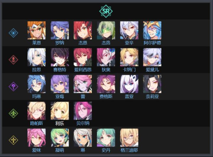 ※↑wiki上截了所有SR角色一览的图,看下文时请自行参照上面的图片对名字。※起码把手上的SR练到蓝3后再评价该SR,这游戏许多职业都是蓝3后翻身的,不要因为前期弱就嫌弃说不好用。※kog会定期做平衡,所以我以当前版本的SR强度为准。※目前游戏正在给所有SR们实装追逐者系统,但现在还有一半没实装完,所以追逐者技能暂时不考虑在内。※不用担心SR的获得难度是否会太高,因为这游戏经常通过各种活动