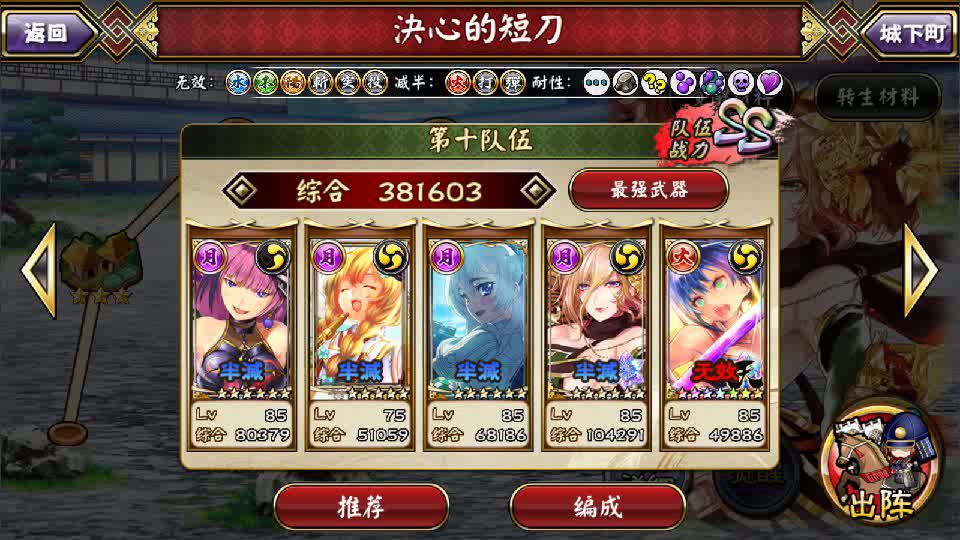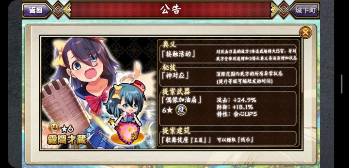 “振兴苍叶,目标武道馆!”——战国时代,三名抱持着相同觉悟的少女走到了一起,为了挽救日渐式微的苍叶,也为了终结纷纷扰扰的乱世,少女们决定,出道成为偶像!大家好,又见面啦,本期卡池是来自苍叶的可爱三人组,强度中上,仓鼠们可以酌情出手,另外水三步池有新免无二,最近入坑的萌新不要错过啦。c位出道!超绝可爱雾隠才蔵!——“请、请大家…好好相处吧……”推荐度3星半奥义:对最高攻击1体超特大伤害,附