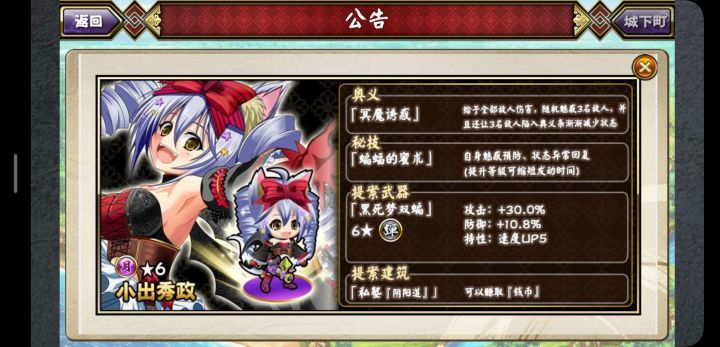 民那桑,又见面了,本周新卡池是小蝙蝠的逆袭喔!还记得当初那只陪伴我们渡过新手期的4星小蝙蝠吗,如今她竟然也晋升成6星神将了!真叫人怀念啊。言归正传,本周的武将强度尚可,对小蝙蝠特别有爱的小伙伴可以多来几发哟。loli天魔!小出秀政!推荐度3星奥义:给予全体敌人伤害,随机附加3名魅惑3名消沉秘技:自身魅惑预防&异常状态回复奥义2c打全体,伤害一般般啦。附带的魅惑消沉在常规本很吃香,由于控