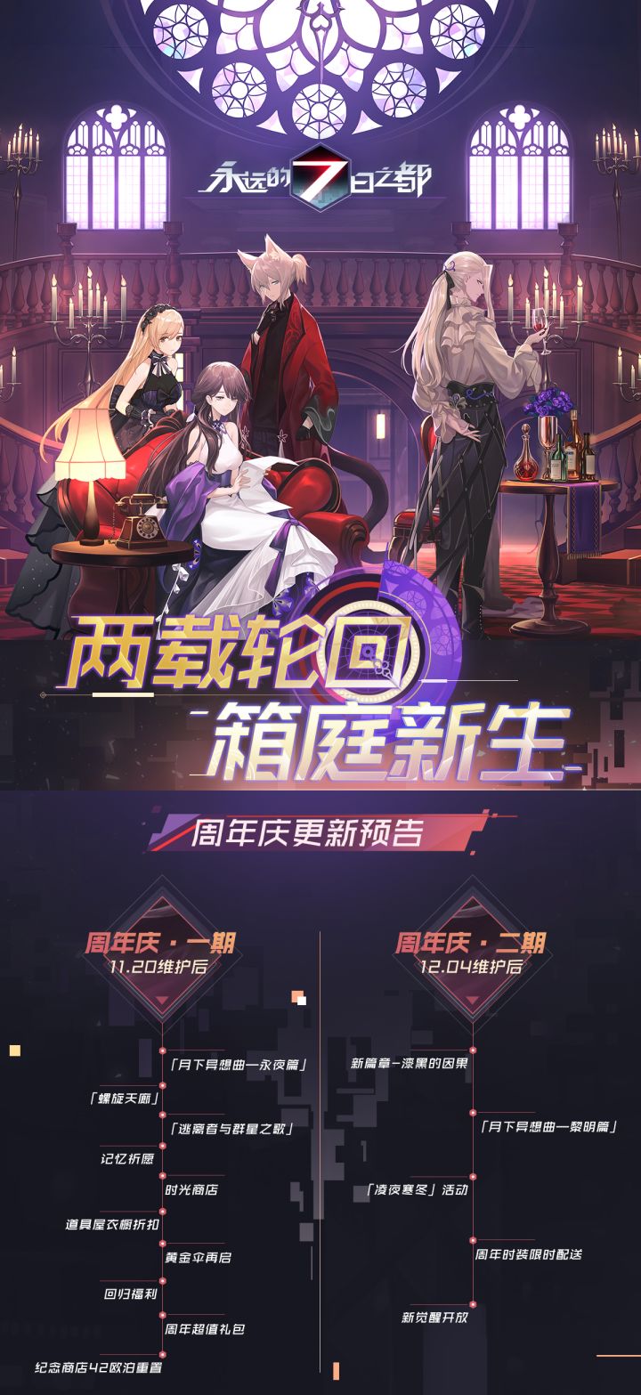 欢迎来到《永远的7日之都》~交界都市与外界的通讯已经恢复,指挥使大人快来看看这里的变化吧!更新内容1、新篇章开启——「终焉的命轮」新的剧情篇章开启!复燃的魂灯与重生的故人,世界的死期与前来拨改命运的术士——每个人都为各自的道推动着星轨的行进,这一次的世界,将产生怎样的变数?△新篇章「终焉的命轮」PV开启条件:进入第三个七天后,查看「战术终端」中的传闻「东方古街鬼魂索命」,选择去「去古街看