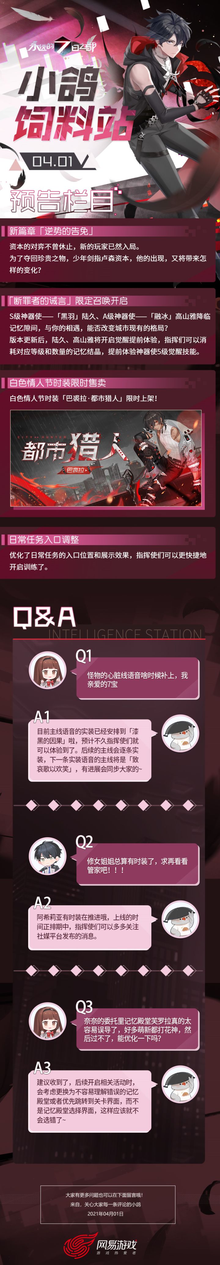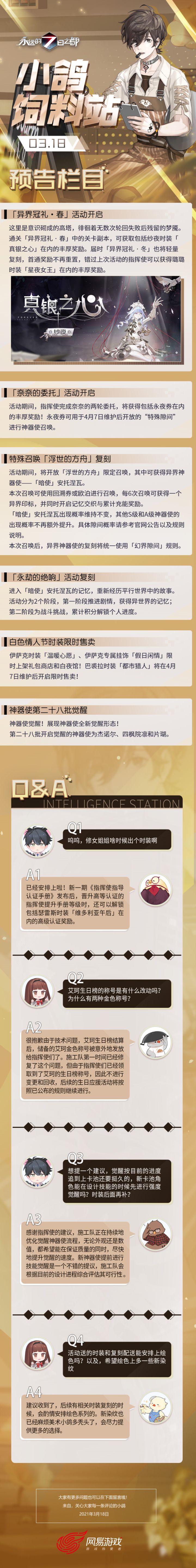 指挥使们晚上好~今日份的小鸽饲料站已送达,「异界冠礼·春」即将开启,还有特殊召唤「浮世的方舟」和「永劫的绝响」活动的复刻消息,赶快和7都督一起看吧!小鸽饲料站以上就是本期饲料站的所有内容~大家有什么问题想要小鸽回答的,都可以在文章下方留言或微博私信@,下期饲料站我们不见不散!