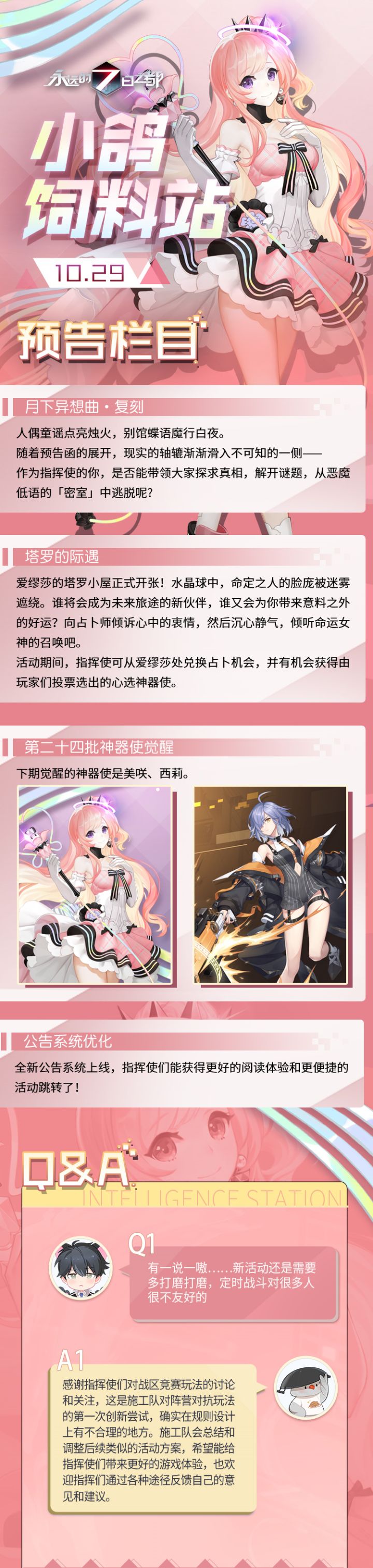 期待已久的饲料站到来!今天的饲料站,不仅给大家带来新篇章「乱序的夏弥尔」和万圣节活动的最新情报,还有新一批神器使加强的名单。精彩内容即将奉上,赶快和7都督一起看吧!小鸽饲料站以上就是本期饲料站的所有内容~是否解决了指挥使的一些疑惑呢?大家有什么问题想要小鸽回答的都可以在文章下方留言或微博私信@永远的7日之都,下期饲料站我们不见不散!