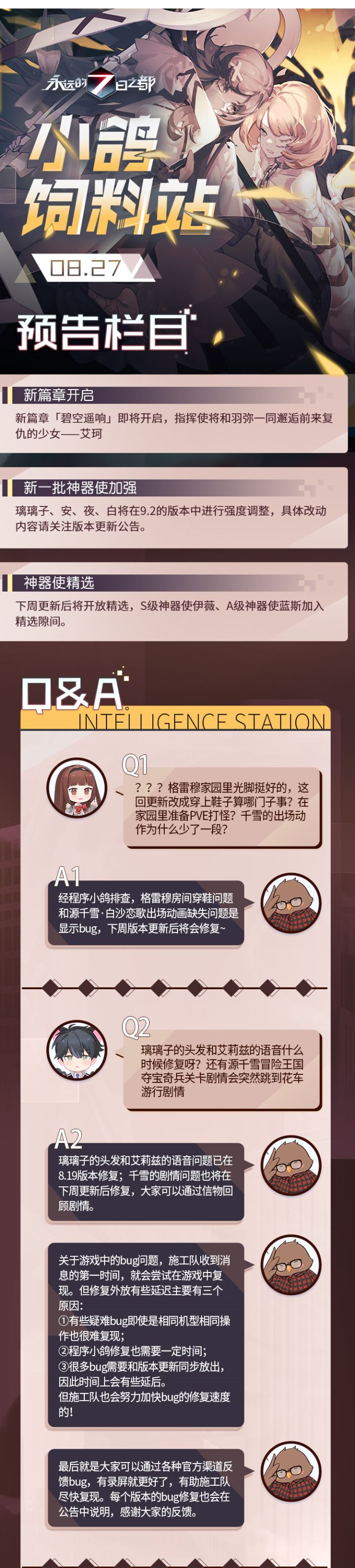 期待已久的饲料站到来!今天的饲料站不仅给大家带来新篇章「碧空遥响」和新一批神器使加强的情报,还对bug修复问题进行了解答!精彩内容即将奉上,赶快和7都督一起看吧!小鸽饲料站以上就是本期饲料站的所有内容~是否解决了指挥使的一些疑惑呢?大家有什么问题想要小鸽回答的,都可以在文章下方留言或微博私信@,下期饲料站我们不见不散!