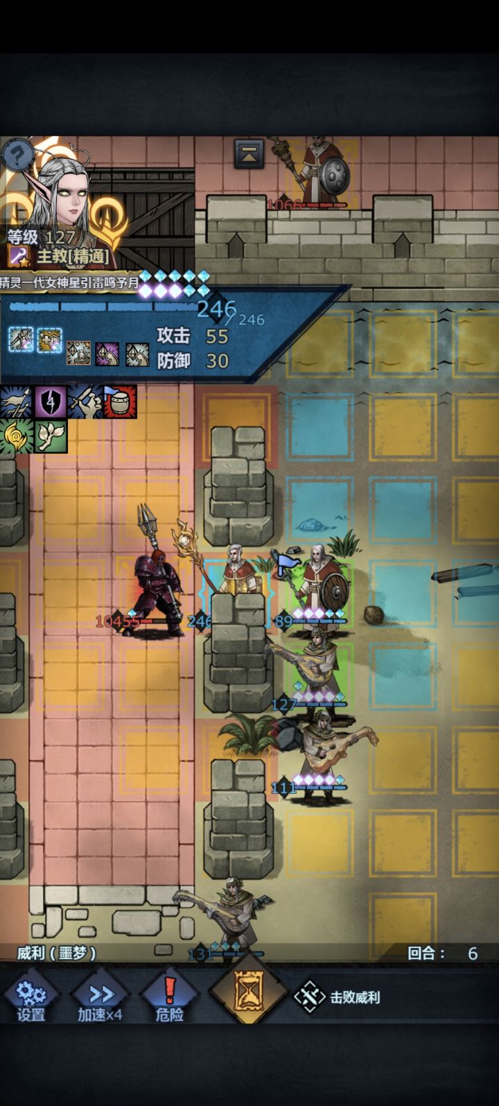 输出带雷主(默认有信仰屏障且意志大于219,低于219比较看脸,复活失败就得重开了),需要一个可以在图示位置卡住统御骑兵三兄弟的坦克(也可以是高敏捷带中国结的角色)。 这个打法比较需要看站位,第一回合可以看到第一个统御骑兵的位置,把坦克的位置拉到统御骑兵的攻击范围,之后再调整到从上往下数第一根柱子与第二根柱子的中间向前一格(图示位置),这个位置基本上百分之百可以卡住三个统御骑兵。 除雷主外要带
