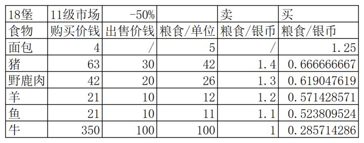 做了个小表格,可以参考一下,18堡11市场,总结就是没有粮食,可以无脑买面包,猪鹿羊有富余的直接换,鱼牛多的卖了更划算