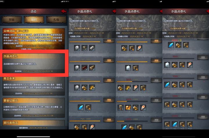 玩游戏要么氪金~要么豹子头,坚决不当不上不下不定期的【水晶消费礼】活动中15档奖励,对于豹子头玩家来说,消费到1000水晶时最划算的。水晶来源全靠第一章以后的每日签到3水晶/天每次更新的补偿50+水晶/次节假日礼包50+水晶/次不定期的签到礼包50+水晶/次…………对于新手来说第一个1000水晶不靠时间坚持领水晶,正常玩起码要剧情第三章以后了,这样就错过了0级小公主需