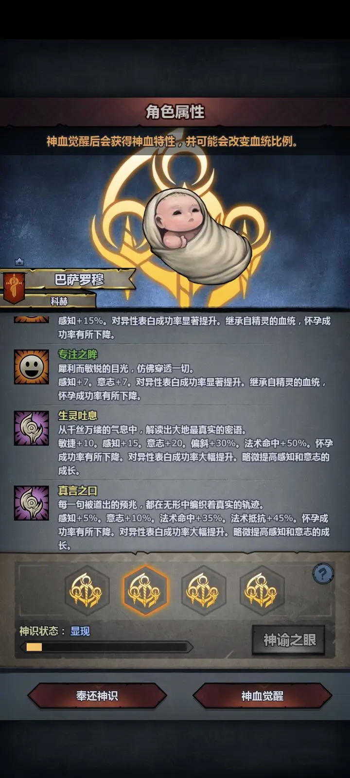极品精神出货概率计算:极品神子为极限感意上自专神8:2或者7:3,神特:恩泽圣颜+真言之口,城堡教育特性:贤者遗传概率:上自专遗传概率:0.3*0.45*0.3=0.0405(出自大佬:无带心的人,https://www.taptap.cn/moment/368189848378409159)精灵王血概率计算:所有可能的血统组合(精灵, 瓦诺)如下:(80%, 20%)(70%
