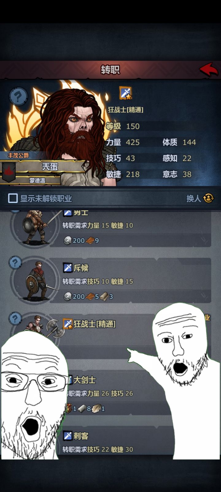 伤治好了,爵位给了,职也转了,老婆讨了娃也有了,这下应该坦然接受剧情杀了吧【转职路线】:4级转重步兵-15体质10技巧转方阵步兵-15技巧转轻骑兵(力量不够就戴上邮件送的饰品骑士之心)——22力30技转皇家骑兵。【转职解锁条件】:剧情传送回赛尼斯特,到王座堡解锁皇骑转职。【转职材料获取】:1.勋章:可以在主线见到老国王时选择结束纷争,或者等活动邮件送声望或声望自选包,让塞宁声望达到友善