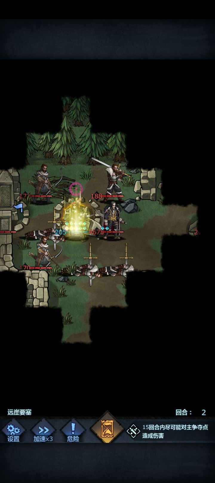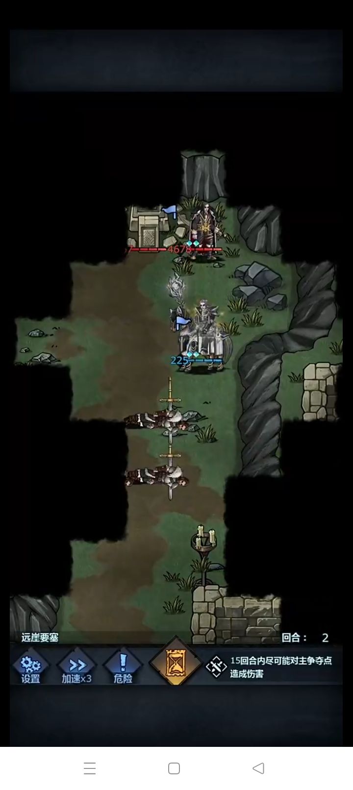 视野为移动范围,地图固定boss为吸血鬼,伤害拉胯,但全图攻击不能主动攻击会跑,boss没蓝可以直接杀。第三个回合有小兵出现在npc附近boss不死塔有减伤打掉副塔之后可以选择位置第二个回合boss会出现在固定的3个位置之一,分别为,主塔左边与上边副塔的中间,或者主塔与右边副塔中间,或者出生点上面,如果碰上了不要主动攻boss可以等反击,或者用雷溅射,也可以用服从,恐惧等控制技能控制bo
