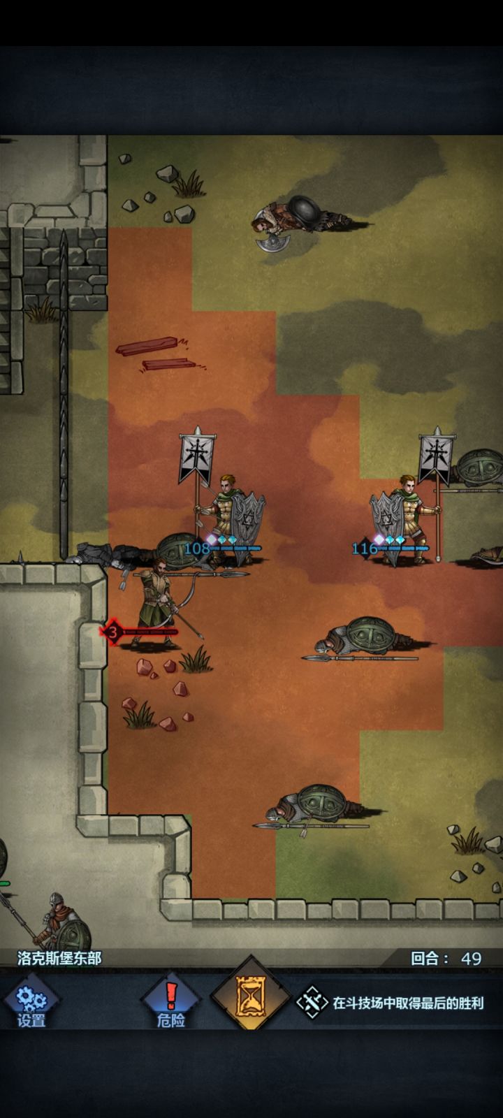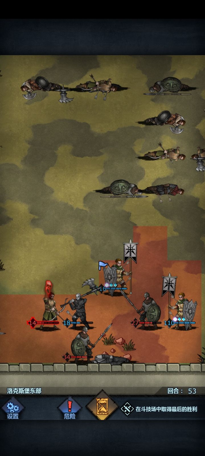 准备两方阵或者王禁,准备3个流血工具人,保险一点可以把主角两个儿子做成流血工具人,开局两王禁带着一个流血工具人往上走,然后靠着上方红血弓箭手,然后在第三回合挂流血(因为剧情第三回合会过剧情,人物不动流血会消失),然后等待过场,看一遍周围敌人有没有残血(低于20容易触发恐惧)有的话重来,然后给弓箭手上流血,第三回合结束,这个时候剧情会补一波兵,不用管,我们把两个王禁挡在弓箭手前面,把流血工具人往后撤