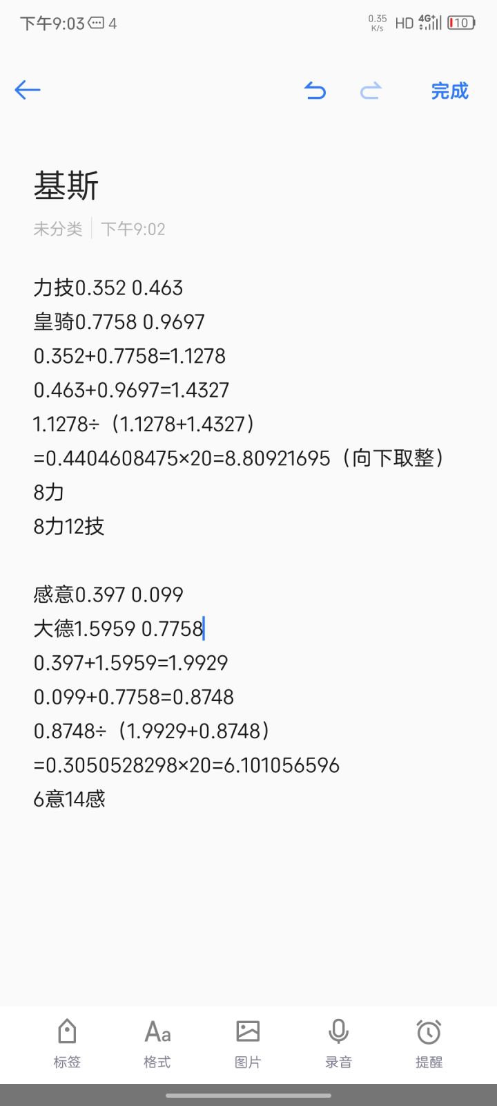 苗子成长数值+职业成长的数值,比如基斯就是力量0.352+皇骑力量成长0.7758,结果为1.1278,技巧0.463+皇骑技巧成长0.9697,结果为1.4327套用公式 力量加成÷(力量加成+技巧加成)×传家宝等级,1.1278÷(1.1278+1.4327)×20=8.80921695(向下取整)结果为力8,技巧为20-8=12技巧