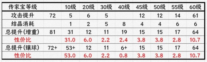 最近发了不少氵帖,收获了一大批“取关”,发些正经点的帖子————————————————————————————————————只考虑攻击较高的物理武器类传家宝传家宝的价值主要是强化提升的攻击。几种常用武器强化提升的攻击如图●只分析双手剑(图来自雪风团队)①命中率、需求力量不考虑。减重磨锋不考虑②多数玩家追求极限力量,所以“传家宝属性价值”按“60力量价值”算。换算标准5属性=3攻击