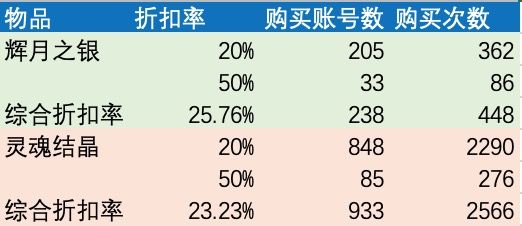 例2:【玩家B】8折购买辉月之银x1,原价购买灵魂结晶x1,消费水晶320+200=520,若按照售价75%购买需消费水晶400*0.75+200*0.75=450,返还差价为520-450=70