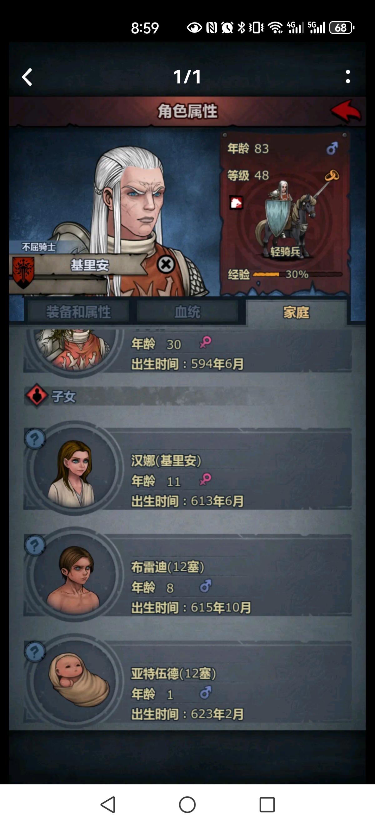 这是我心血来潮新开的一个小号,来到希尔国第二章的时候,有一个春林节,就在希尔王国。我当时就没什么有爵位的人物,就一个基里安。我就把他安排上了。到老基的时候,我记得有一个希尔的骑士,就选了她。嘿,没想到成了!大家都知道,老基在老国王回塞宁的时候就强制退休了,更别提结婚和创一个基里安家族。我当时还就没怎么管,但是到了老基快退休的前几年,卡法拉森林的那游戏里的三年,我惊奇的发现,老基居