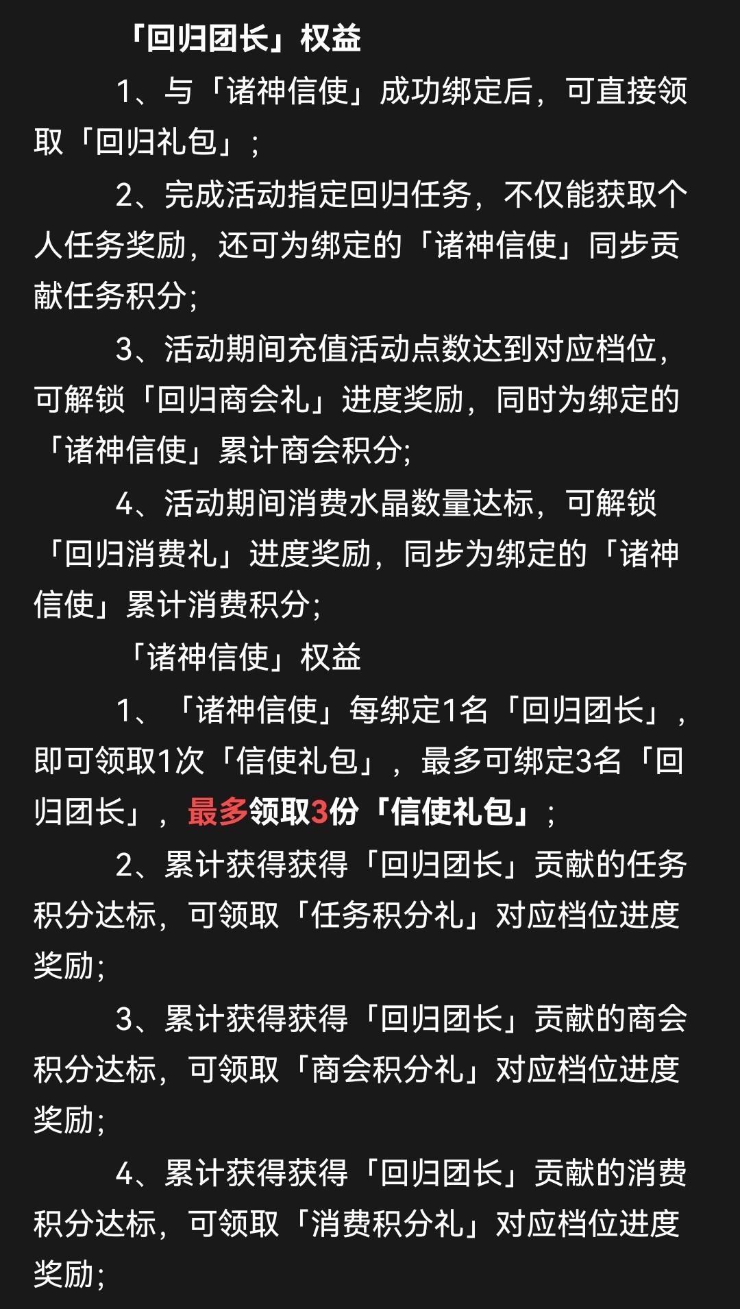 有没有搞错啊喂?我突然发现个事!信使最多能绑定三名回归团长,而问题来了团长只能绑定一名!又或者信使三带一,信使要邀请其他三名团长共同组成个帮俗称四人众!也就是狼多肉少,回归团长少!而信使却多,也就是信使要搞竞争搞谁充的多才能抢那少量的团长,那剩下的豹子头咋办?六百六十六阿戴尔这招太狠了。 只能说阿戴尔你赢了,为了多营收这个狠招都能搞出😨。『诸神策划是个人才』这个狠招都能想到不知道营收要翻多少,尽