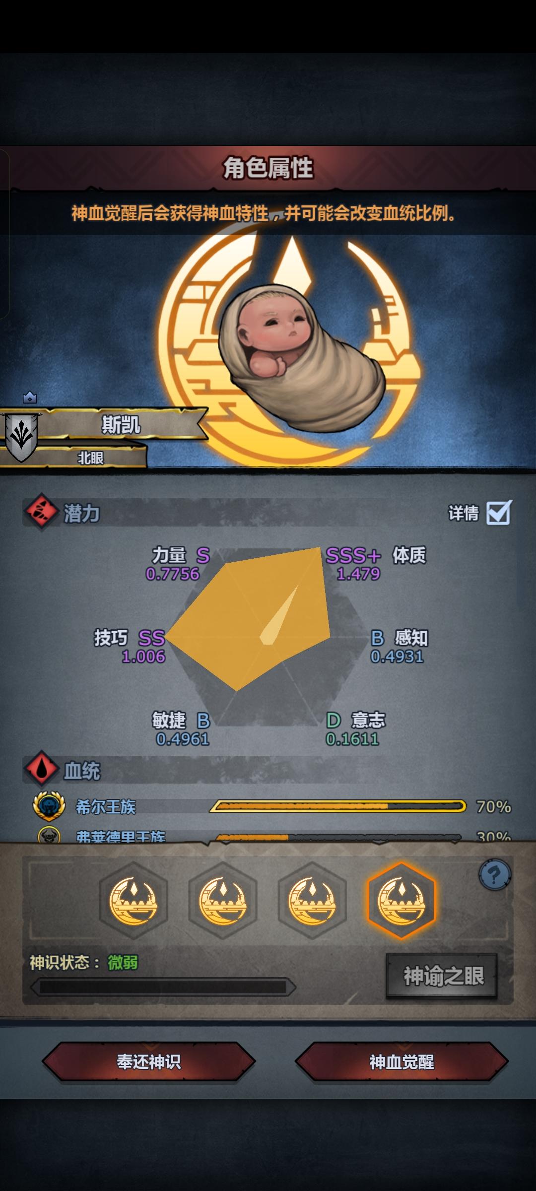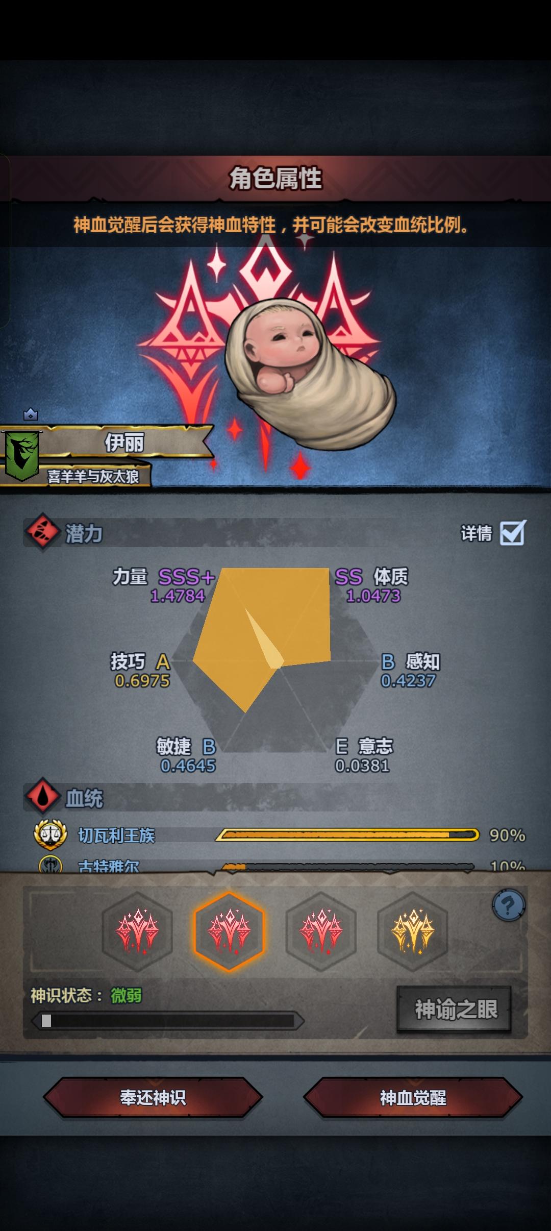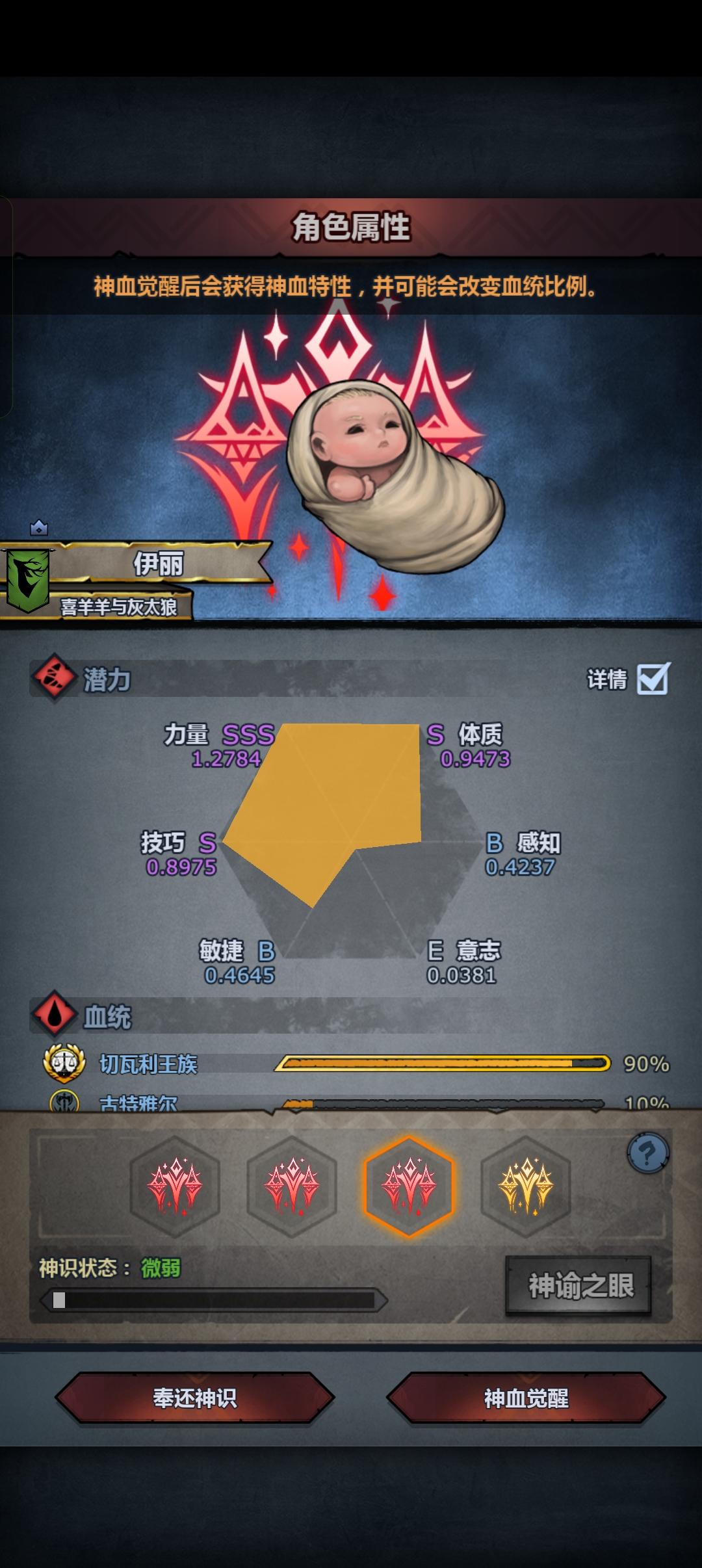混完血之后,千万千万要把那些混血夫妻踢了,不然出一个极品真的会被气死…我这边突然弹出三个特性的sss力把我吓了一跳,还好没出完全,不然真的要退一段时间了,然后有个小问题,sss力同狮恶魔之眼➕一个神特是不是也还行?