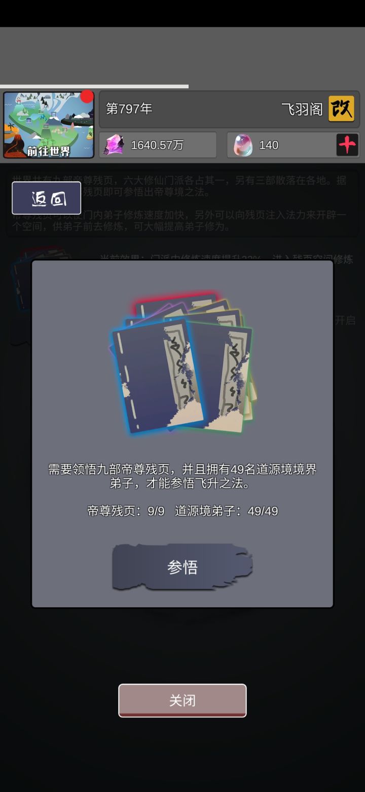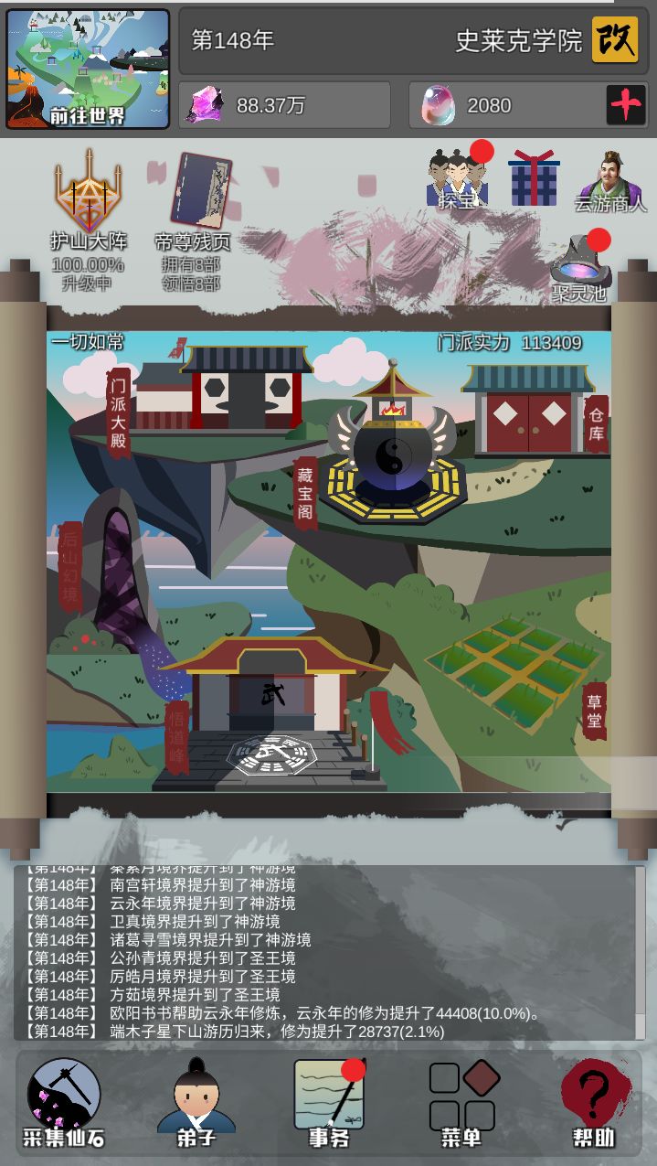 成就:1.通关2.全弟子道源境3.弟子天赋最低1.45,有21位弟子天赋2.5(遗憾没有刷到全2.5)4.弟子装备,最好装备极品共46件,最好装备仙品共54件(遗憾没有刷到全仙品)5.击败谢广鲲6.护山大阵满级(20级)7.门派实力456984下面会说一下攻略
