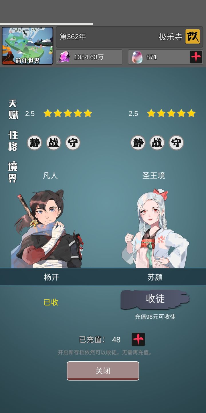 这游戏上瘾,一玩就忘记时间,但是感觉玩法还有点少和其他门派都是死敌,也没见别的门派打过我,所以互山大阵有啥用。。还有人物筛选的多一点选项,比如寿命、忠诚度还有修炼长按到100%的,虽然后面会很快但感觉完全没有必要弄啊,点一下修炼直接开始不就行了嘛。。。炼丹可以指定炼哪种丹药,炼丹炼武器再搞个熟练度可以加成功率的那种门派功法 方面:门派功法不应该只有四种,而是有很多功法然后弟子们除了主功法