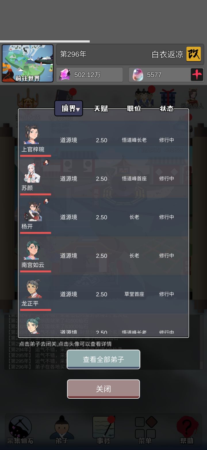 图就不发了,前两次玩的时候,不看资质,导致弟子疯狂仙逝,卡死了。第三次我痛改前非,只招三星级及以上的弟子,前期发展慢,结果被几个门派围攻,残页都被抢了。