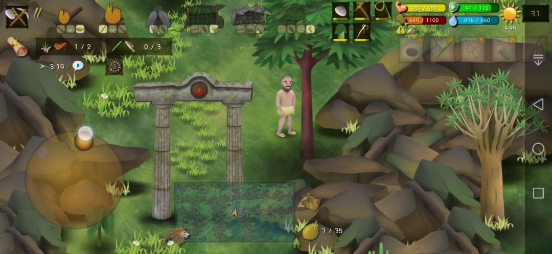 背景:手残,已经彻底放弃打猎了,无兽袭。其它图:地图:绿色是两片竹林,竹林上方的紫色区域可以建第一个营地,竹林中间的黄色区域(几丛石头中间)可以放大套索陷阱捕野猪和捕鳄鱼陷阱。开局:海岛地图是没有淡水的,但椰子非常丰富,一个椰子可补充100淡水,完全够用。尽快做竹竿套索摘椰子,淡水过滤器不急着做。如果把营地建在两片竹林上方,可以考虑建石屋,竹林上方的干燥走廊地带大石头比较多。工具:斧头