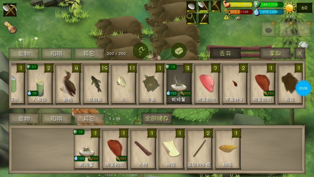 这个地方是我觉得最适合当营地的地方 前期毕竟容易度过 旁边物资丰富 图中很多路标 都是我觉得比较重要的物资点 你们也可以这样做在营地右边有两个竹林 陷阱放这些地方比较好两个任务 第一个海星 5个海滩各一个 可以用读档刷 运气不好的话比较耗费时间第二个任务 海鲜大餐 我运气算是比较好的啦 第一次遇到龙虾就射死龙虾了 我不知道为什么打海里的东西总是射不准 导致我有一个营地食物满了 但是都没有鱼