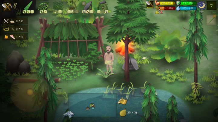 1.老头与狗:物资和食物丰富后可以保证很大探索范围后建议做隐藏任务,隐藏任务很麻烦,浪费时间,也没有收益,只有一个成就。地图正上方有一个V字形的石头林,V形下端和V的右上角有缺口可以进入。这里说一下,V形石林的左上端有很多的生姜,重要物资,还能回复健康值。V形石林的内部左端靠一颗树有一个老头,,靠近并喂水触发隐藏任务。注意,给老头喂水后你的碗就会消失,还要再做一个,一会的狗也一样。狗在地图的右上角