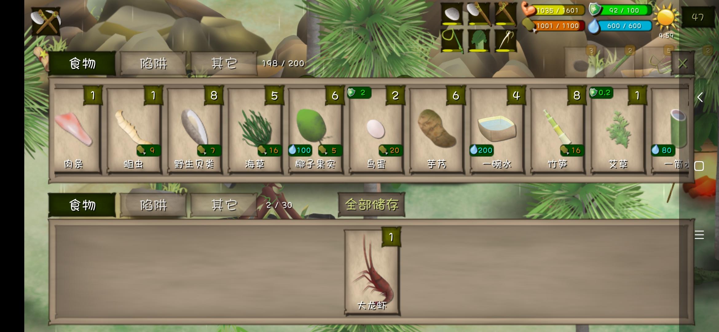 😭😭😭😭😭😭😭😭我的大龙虾,被鳄鱼偷了,海鲜大餐还没坐呢。不是说先偷第一个营地的东西吗,我把龙虾放在第二个营地了,怎么被偷了。(晚上鳄鱼偷了我的龙虾和椰子还是椰子肉忘了)然后下面的图是两个营地的距离,还有,第一个营地放的所有食物,是不是这些食物他不偷?所以偷到第二个营地。退出,重新开始这一天,然后现在我把龙虾拿到身上了。