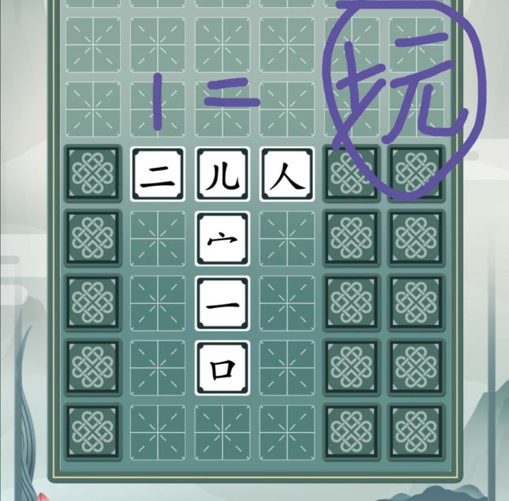 第一步:拼“坃”第二步:“人”最底部堵住,然后“夫”掉下来成为“呋”第三步:用“二”和“Ⅰ”拼“王”第四步:“宀”最底部堵住,然后放“儿”和“二”拼“完”