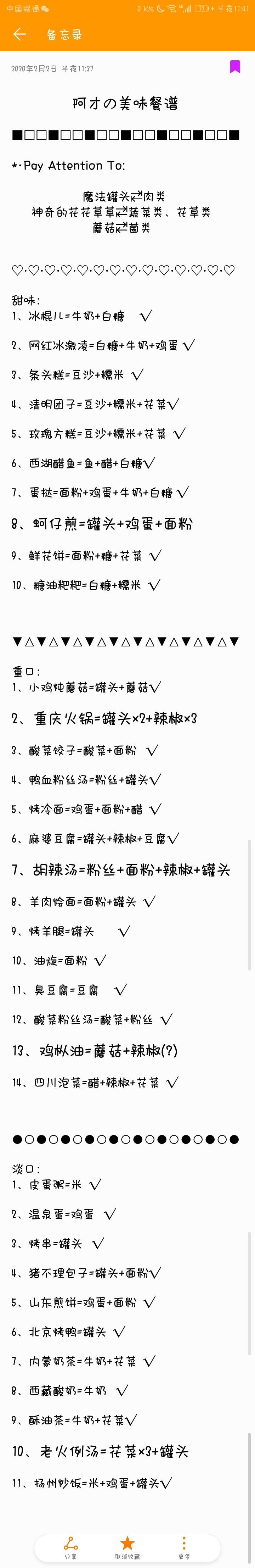 嘿嘿~这里这里!!(Ps:阿才是我家小猪的名字~然后,打没打勾的,是我有没有做出来的区分啦~不是正确与否的标志也就是说~只有打上问号的是不确定的,其余的无论打勾了没,都~是已知已、确定的菜谱哦!好啦,没有什么要补充的咯!看图看图~~我先溜啦,886(@^^)/~~~)↓↓↓↓↓