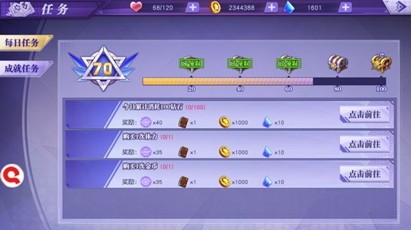 任务系统在《神契幻奇谭》中非常重要,是玩家如何提升自己的指向标,同时也是玩家领取奖励的系统。任务分为每日任务与成就任务。A、每日任务。完成每日任务会得到小奖励,奖励虽然少,但是日积月累奖励就非常可观了,是玩家提升战斗力的重要途径。完成每日任务还可以获得活跃度,活跃度达到20、40、60、80、100可以获得宝箱奖励,有大量的钻石及各种材料。B、成就任务。成就任务是玩家中在游戏中达成成就后