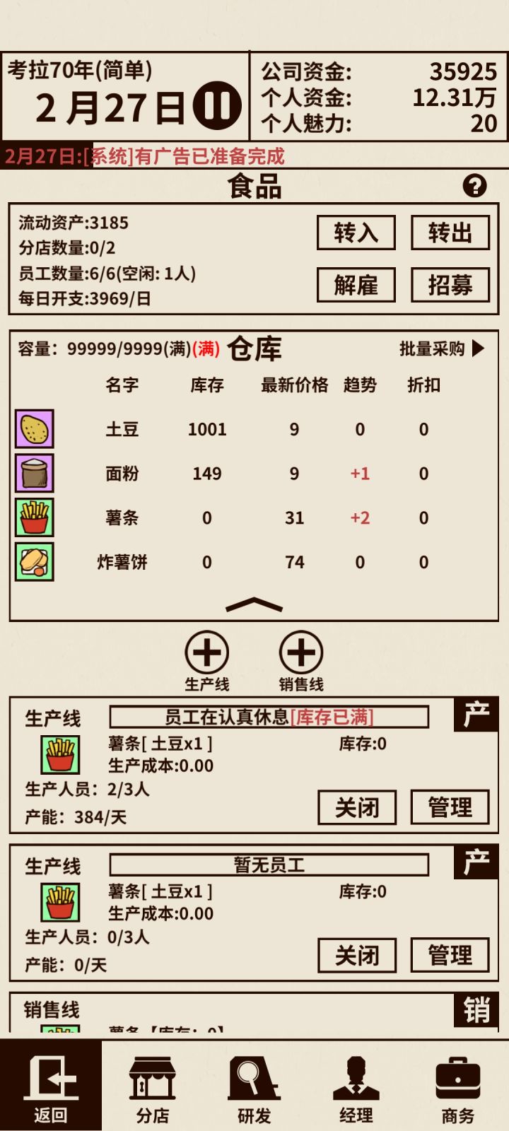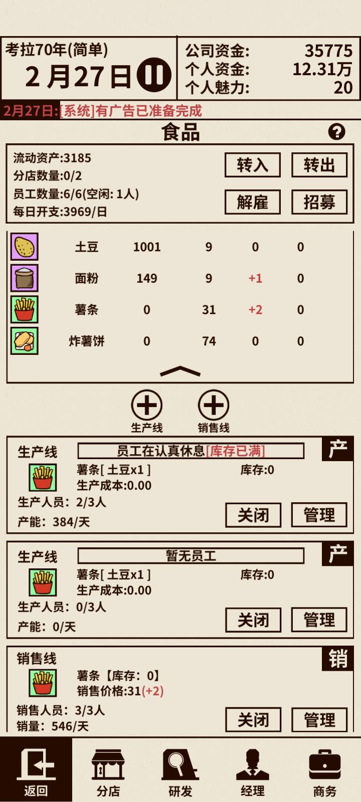 一、开局操作:1、赚钱2、升级机器人→参加机器人比赛→聘用经理①每次参赛前三名就有5-10点魅力值,基本上2-3局就有15点魅力值②魅力值15点,便可聘请经理,解放双手,只需点击研发来升级机器③开局不停升级机器人,都会获得前三名3、升级医疗研究4、拍卖会:魅力值↑5、不必急着开分店和开其他公司,收支盈余多才进行下一步二、功能介绍:1、医疗研究+机器人研究①医疗设备=续命,升级