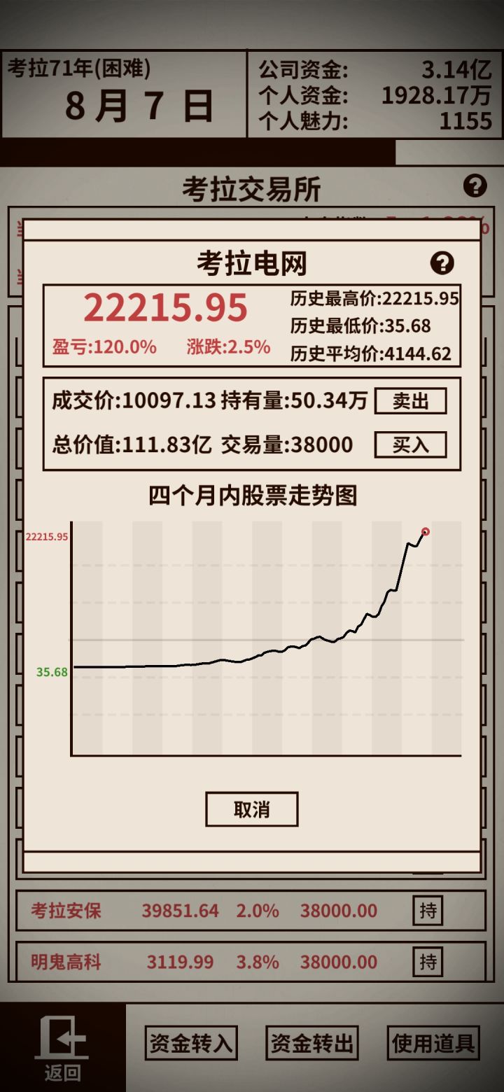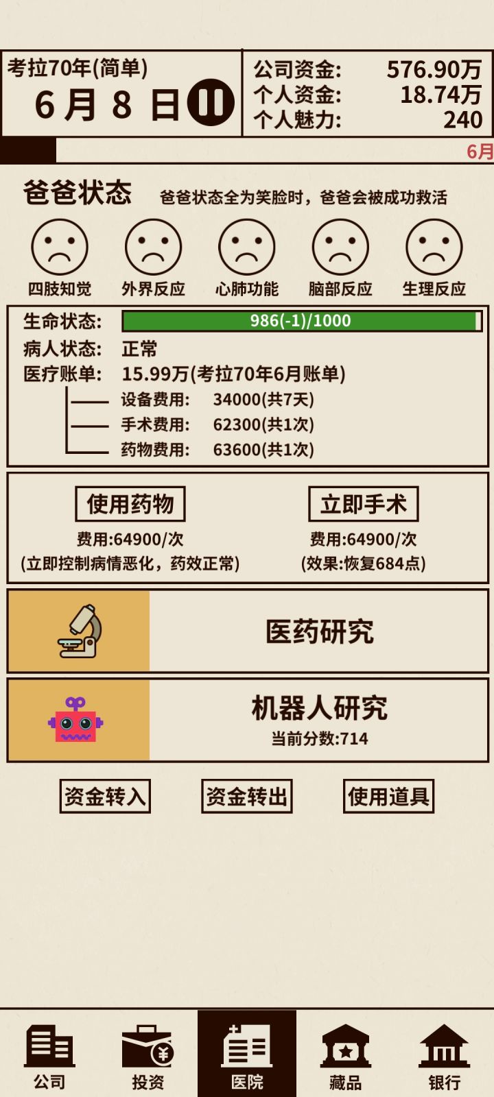 3月开始发展两家店。同时留部分钱升级2科技(先不用开电子厂,4月在开,前面机器人大赛不能保证第一,只能保证前三),准备手术,4月第一次恶化,并且可以一次补满,就是手术时间。到4月初停下两家店的发展(我参加过两次拍卖,多两家分店,40万),7—8天时间,用来还医院钱。