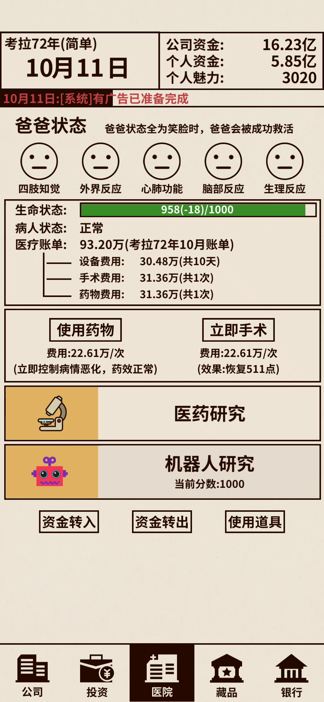 属实想说噩梦难度,救活游戏主角的爸爸真是难得一批。快死了就看看广告。明明处于事业上升期,还要用大量开销去拯救爸爸。还有就是噩梦模式里面,爸爸治疗费太高昂了,前期不管多久都不可能赚的到那个数字,开个公司也是惊人的贵前期又要发展其他公司又要自己手动购买食材。最想吐槽的还是我招募经理居然还要魅力值,魅力值的提升又需要升级机器人(升级的价格还算好,就是时间久还不能同时升级)或拍卖(前期不可能没有一件拍的起)。不过噩梦的也可以说更接近现实吧,长时间不支付治疗费也会直接停用设备和手术(不过这个手术就太不现实了一个老年人怎么可能受得了多次手术)🙋🙇