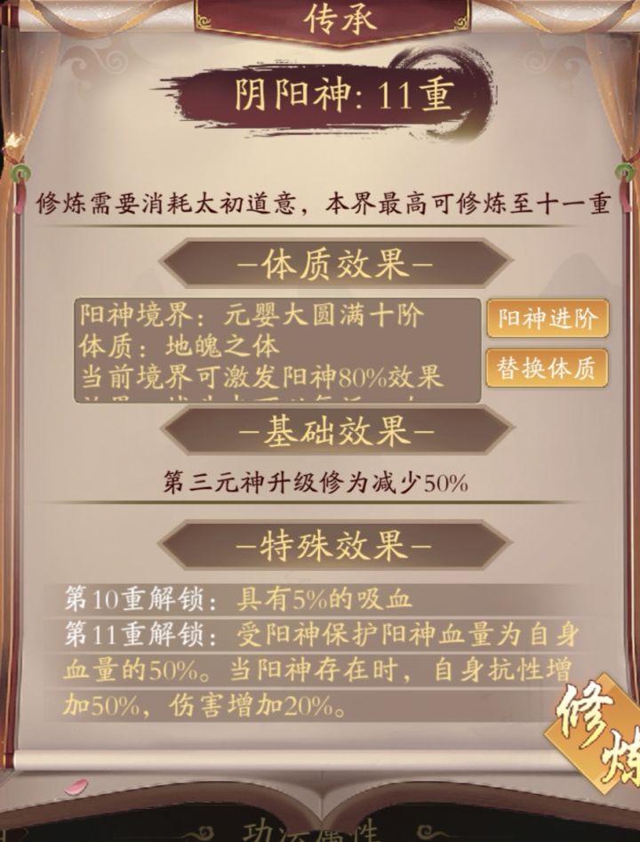 修真江湖-元神篇游历任务完成之后,练习分神术,可开启第二元神,元神可用于装配第二体质。第二元神初始为结丹初期一阶,初始激发效果为30%。第二元神最高可,激发效果为79%,第二体质最大激发效果80%。第二元神升至结丹大圆满十阶时,可使用玄牡参提升至元婴初期一阶,将第二元神凝练为第二元婴。第二元婴可继续升级,每级可获得修为速度0.1%。如第二元婴为元婴大圆满十阶,可提升修为速度5%。目前