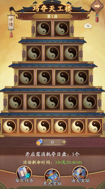 活动时间:9月3日-9月5日活动范围:开服时间≥8天的区服活动说明:1、活动时间内完成每日任务或累计充值可获得夺日盘,开启天工楼2、巧夺天工楼每一层有不同奖励,层数越高奖励越丰富,开启需要的夺日盘越多3、若直接开启了该层的终极奖励,则可以领取该层全部奖励,并直接进入下一层4、根据通过天工楼的座数,可以领取额外奖励