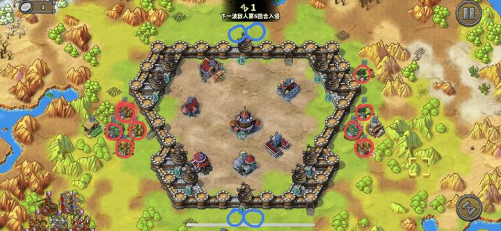 目前城防都是在四个拐角,一次只出现一个拐角一批部队,可以利用山地地形和池塘进行围堵,进行瓮中捉鳖。1.站位:8将时左右各四个人,后期12将时再补充上下2人。前期,某个角落出现兵本回合就可以赶到,并进行消灭,之后返回原中间位置,等待下波兵线即可。目前中期,出现的部分兵种移动距离超远,无法限制其活动范围。放任不管会造成城墙破坏,分兵追会造成兵线溃败。后期,敌军逐渐强大,可以用地形和将领构成城墙