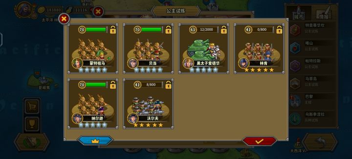 真的只是随手一打,就从5一口气打到8,开了一把熟悉了地图第二把就打通了。。和弓兵骑兵试炼根本不是一个等级的配置:拿皇的圣骑2完全没用,建议匀给艳后路线:目标:普普通通的红圈目标,其中上下路炮塔全是红圈,中路是黑亚瑟和雅典娜双boss设施:中路绿圈炮塔开城门,上下路绿圈房子开对路炮塔和中路狼。支援:上路下方李舜臣(专武+奶瓶,310)、萨拉丁(专武+雷霆、310);中路狮子亨利(7级奶瓶