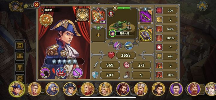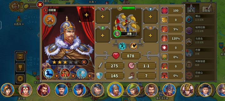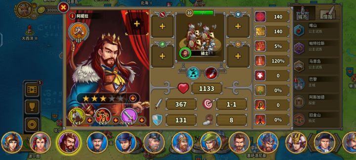 马恩岛第4关只靠艳后和贞德只能勉强通关,想要3星最少还要养个理查。帕特拉斯第4关不养苏莱曼和凯撒过关都难,就目前来看,还是帕4最难。喀山的总体感觉还是比较简单的,不用养任何金将和非指挥官的紫将就能三星通关。下面是我通关喀山6的阵容,骑指一路摧枯拉朽,阿提拉和神素就是喀山6的MVP,打了一次就20回合就通关了,比步指猛多了。