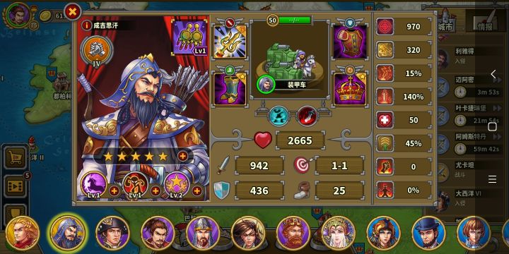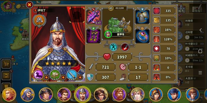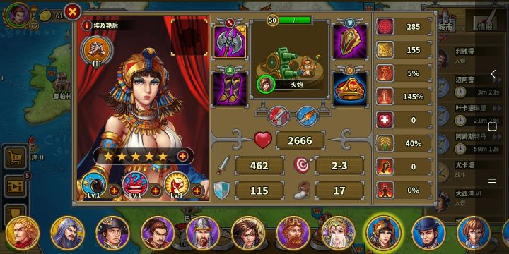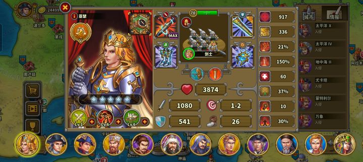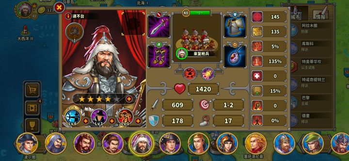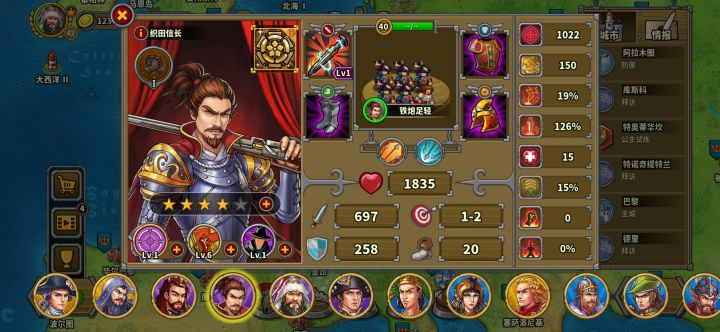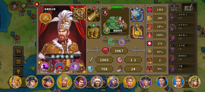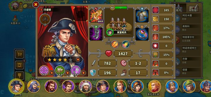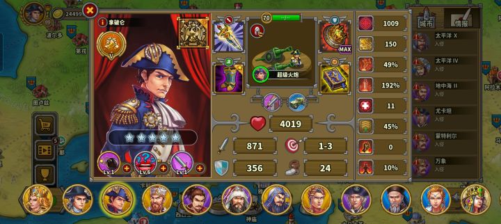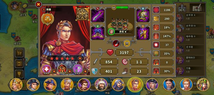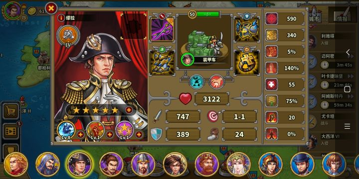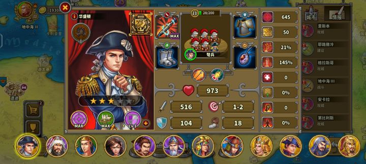 玩的第三天氪了华盛顿,成吉思汗,缪拉,速不台,奶瓶,天丛云,神话礼包。勋章和文献没有氪现在普通战役航海时代打完了,帝国等级43级,文献500,还差100,准备今天升到火器时代。华盛顿,织田信长先不升了。其他将升完星要6200章,我还剩5000章,将领技能就升了织田信长和奶弓的领导力升到了6级,还有阿提拉,缪拉以及速不台的一技能升到了6级(缪拉技能就升到4级),艳后的鼓舞升到了6现现在有点儿