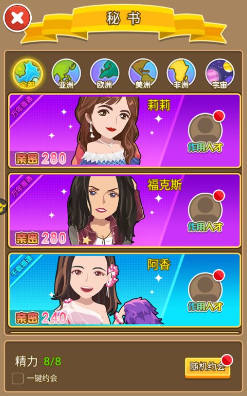 相信各位老板每天上线之后除了打理日常商务,最令人激动的就是和秘书约会,一起去环球旅行啦~之前也提到过,老板们可以先进行环球旅行,将有可能邂逅到的秘书好感度加上去之后,再去进行一键约会,因为约会产生的经验值=好感值,聪明的老板绝对不会放过一丁点增加秘书经验的机会,因为经验越多,可升级的技能就越高,提高的赚速就越多!所以!看似旅行花费巨大,但是花出去的钱依然是回到我们自己手里,是稳赚的投资!何况还有