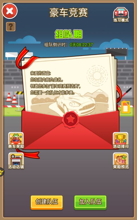 夏日激情赛车来咯!老板们带上你们的豪车,尽情组队玩耍吧!老板们可以选择自己组队或者加入别人的队伍,有队伍的玩家才能进入预选赛,组队时间仅在今天,老板们叫上亲朋好友抓紧时间组队咯~因为每人每天有限定次数的比赛机会,每辆车各有一次比赛机会,所以大家要练习好才上去比赛。那么赛车要怎样才能获得好成绩呢?其实很简单!在一分钟之内赛车跑的里程越多,成绩就越好!两条赛道上都会有加速道具(汽油)和减速道具(