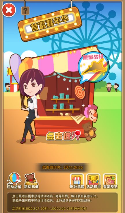 广东的天气逐渐炎热了起来,老板们都开始复工了吗?春天就要有春天的干劲,在勤劳工作的同时别忘了放松心情,首富嘉年华这就安排上啦!【首富嘉年华】和小秘书一起畅游游乐园,还有超多福利等你来拿!【活动时间:2020年2月27日-2020年2月29日21:59:59】同时参与活动排行榜还有机会获得限量战机券、人才称号、橙色秘书碎片、超能水晶碎片和其他稀有7星座驾,还有更多福利等着你!未消耗的活动积