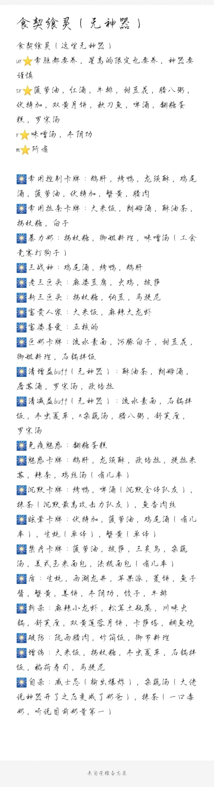 这里是食之契约飨灵图截止至八月初的总结,分为技能部分和神器部分,总结来自于我平常用的卡和一些大佬和现阶段新人常用卡,希望可以帮到大家。喜欢的话欢迎顶帖。