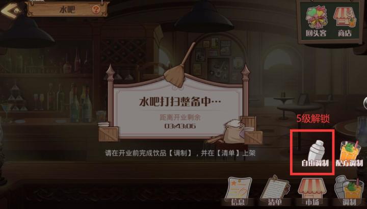 5级水吧,每天可上架9杯饮品,新增1种市场材料(奶油)、4款饮品配方~除了以上部分,5级水吧还解锁了自由调制功能,目前攻略组试出了2款隐藏配方(下文会公布)Ps:此攻略适用于5级水吧~【5级新增饮品配方】※蜂蜜苏打(章鱼烧)手法:搅合法配方:奶油*1+蜂蜜*3+苏打水*3饮品券:35知名度:10Ps:注意食材调制顺序,按我列出来的从左到右,而非系统的原始排序!※飘舞(香槟/鳗鱼