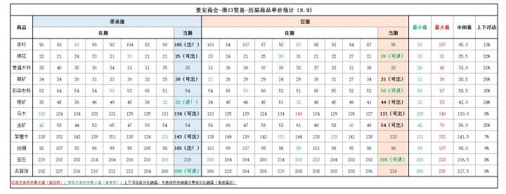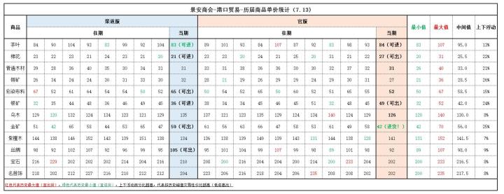 【官服】◆出货建议铜矿(31)银矿(44)乌木(131)金矿(54,非高价,被金矿占满仓库,需要货币流通周转的可考虑出一部分)☆这期没有特别推荐出的(没有特别高的价格),出于占仓库+货币流通周转的需求,可考虑出一部分~◆进货建议棉花(20,最低价)彩染布料(50,最低价)宝石(200,最低价,但一般不建议,宝石/名首饰=单价高利润低)☆建议进棉花+彩染布料,比较保险,不会太赚