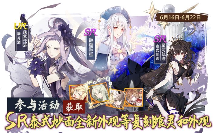 亲爱的御侍大人:感谢大家对食契大陆的关心与喜爱,【六月第三周活动预告】活动预告来啦!快来看一看吧!❤★活动一 返场狂欢会第二十期珍稀飨灵返场★活动时间:6月16日更新后~6月22日23:59活动名称:返场狂欢会XX活动描述:活动期间,返场狂欢会主题活动第二十期全新上线。每日完成任务可领取抽奖道具,参与抽奖即有机会获取全新SR泰式炒面全新外观-星河轨迹、UR屠苏酒复刻外观-落紫泛涟、SR飨