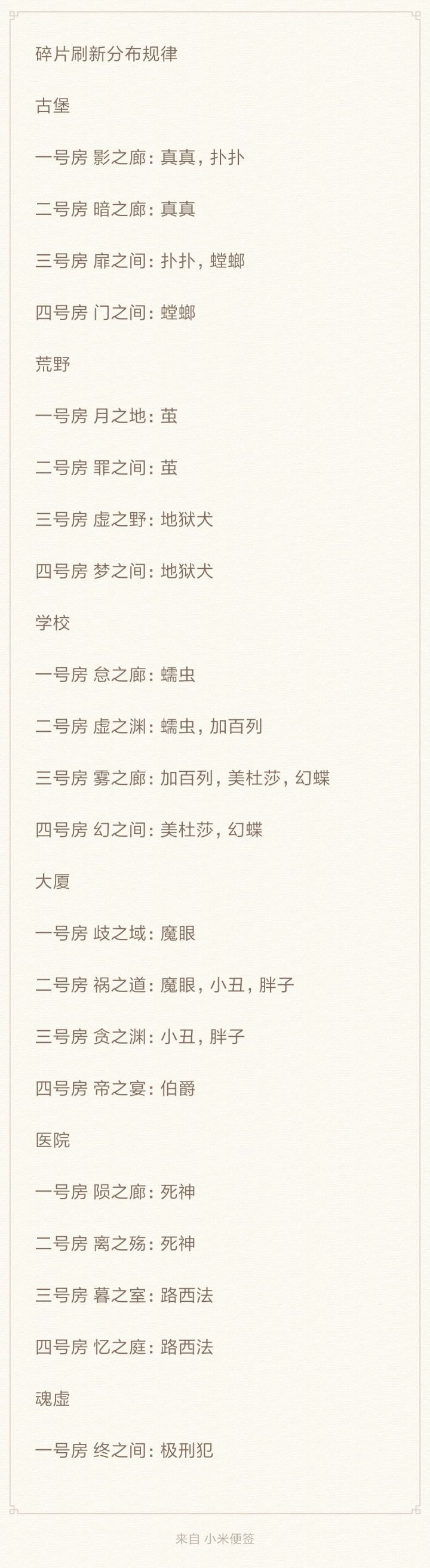 作为叠图流的创始人,本萌新来讲讲如何快速刷碎片首先,碎片刷新机制有一条是这样的,每个小房间只能刷出三个碎片如果满了,只会刷出别的房间的碎片而每个房间刷出的碎片都是有区别的,所以我们把所有房间叠满碎片再只清自己需要的房间,就能在一定程度上控制刷新的碎片第二,关于碎片刷新的时间。在线每四分钟刷新一个,一小时后停止刷新。离线每半小时刷新一个,六小时后停止刷新。而事实上,事实上,我们退出游戏x分钟后