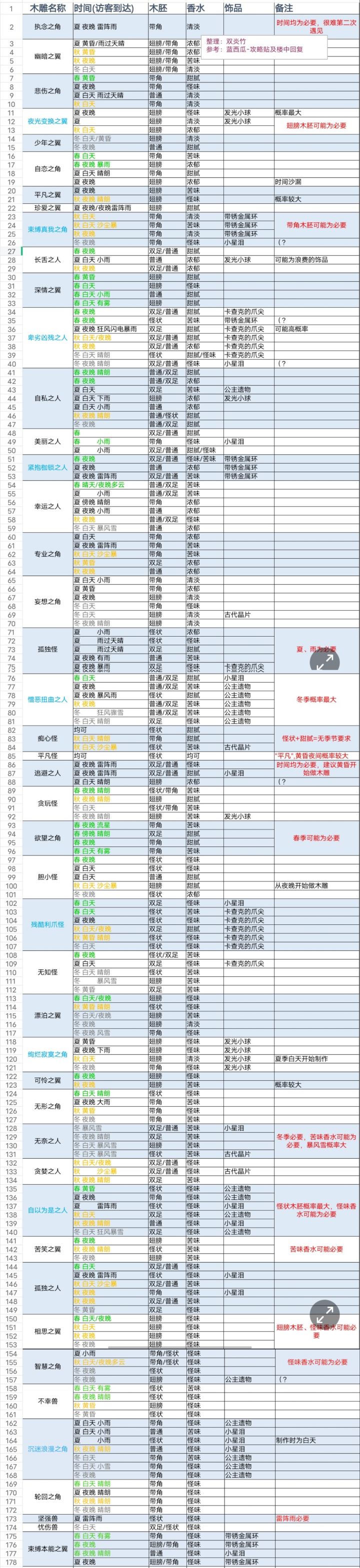 本帖会详细介绍本游戏的各种机制,使玩家少走弯路,更高效的完成全收集,(不过 佛系才是本游戏精髓👴🏻)。第一季所有支线木雕配方都整合在本帖评论区(点击最早回复或只看楼主方便观看),第二季支线木雕配方在这个帖子里☞——————————正文————————已知制作木雕时,木胚 香水 装饰品,还有木雕归还时的季节和天气,将会影响各种木雕的获得概率,注意只是概率,不存在百分百的一一对应关系,所以,我