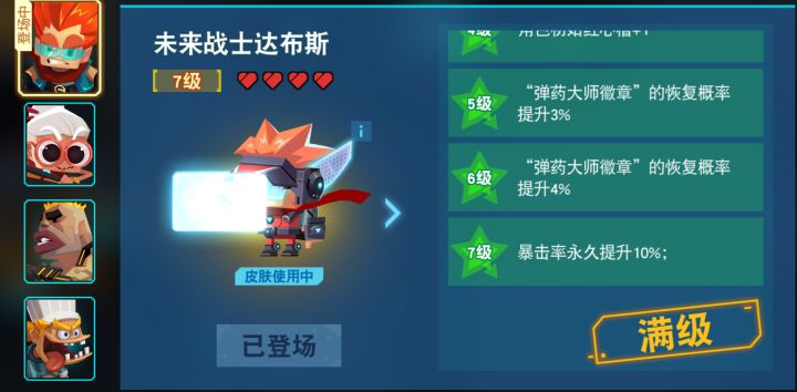 我会按人物强度,手感,操作性,性价比整体排名!达布斯,免费人物,皮肤自带技能,开局多一个黄心,初始武器离子手枪,冲击钻,最强自带武器!主动技能,技能强度S升级后一次发射3发子弹,简单,粗暴,强力!被动技能,技能强度A人物满级后,妈妈再也不会担心我没子弹了。人物核心被动,因为达布斯满级有10%暴击,有了士力架后就可以无脑开主动突突突,新手强烈建议第一个升满级总结操作指数★★★★人